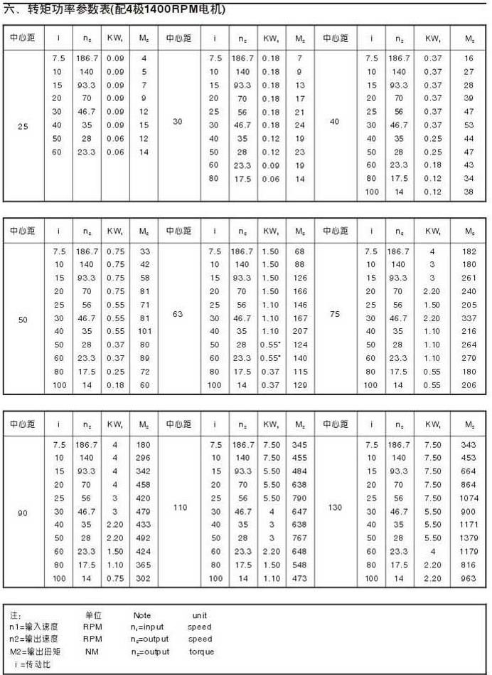 轉(zhuǎn)矩功率參數(shù)表(配4級1400RPM電機(jī))